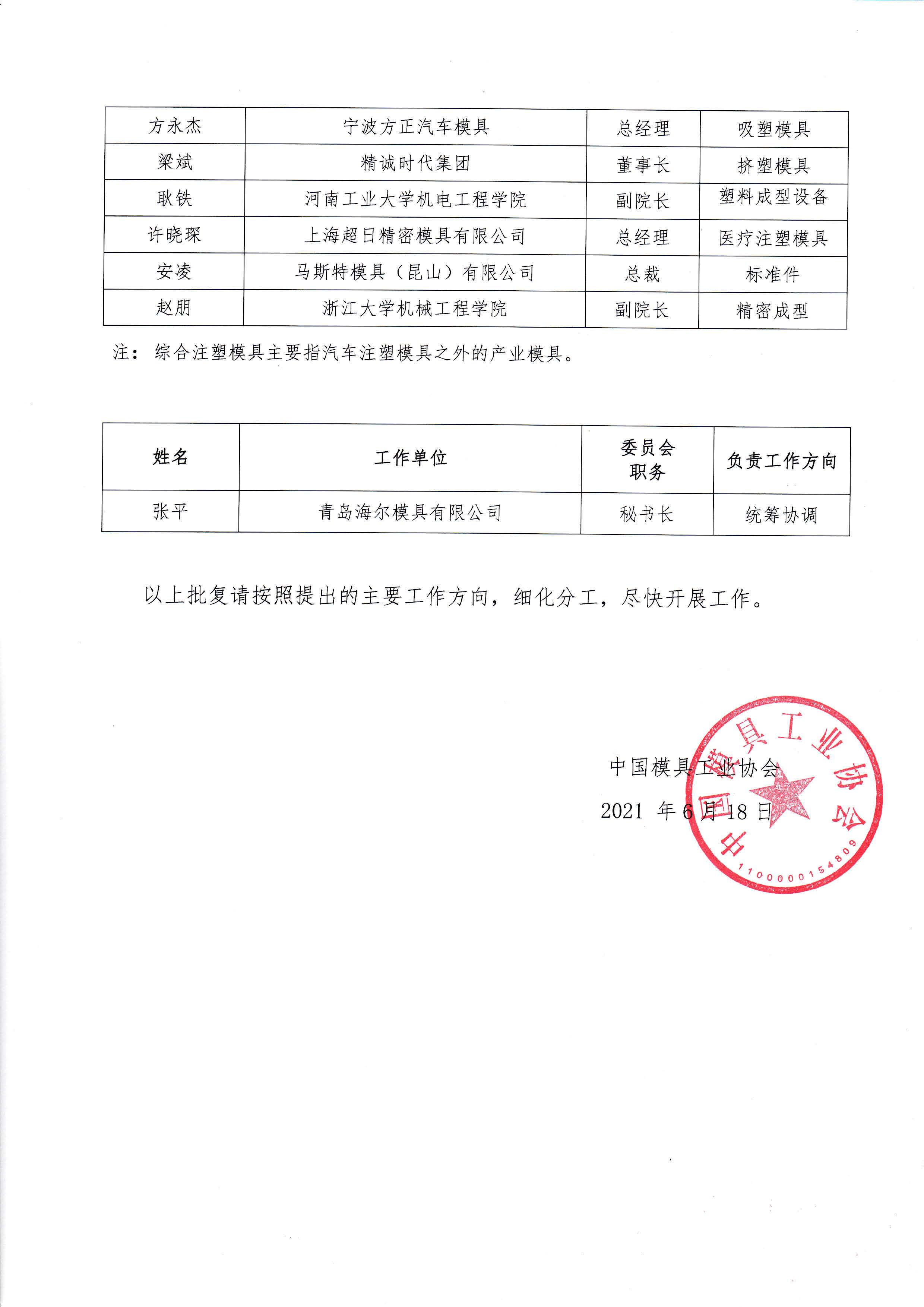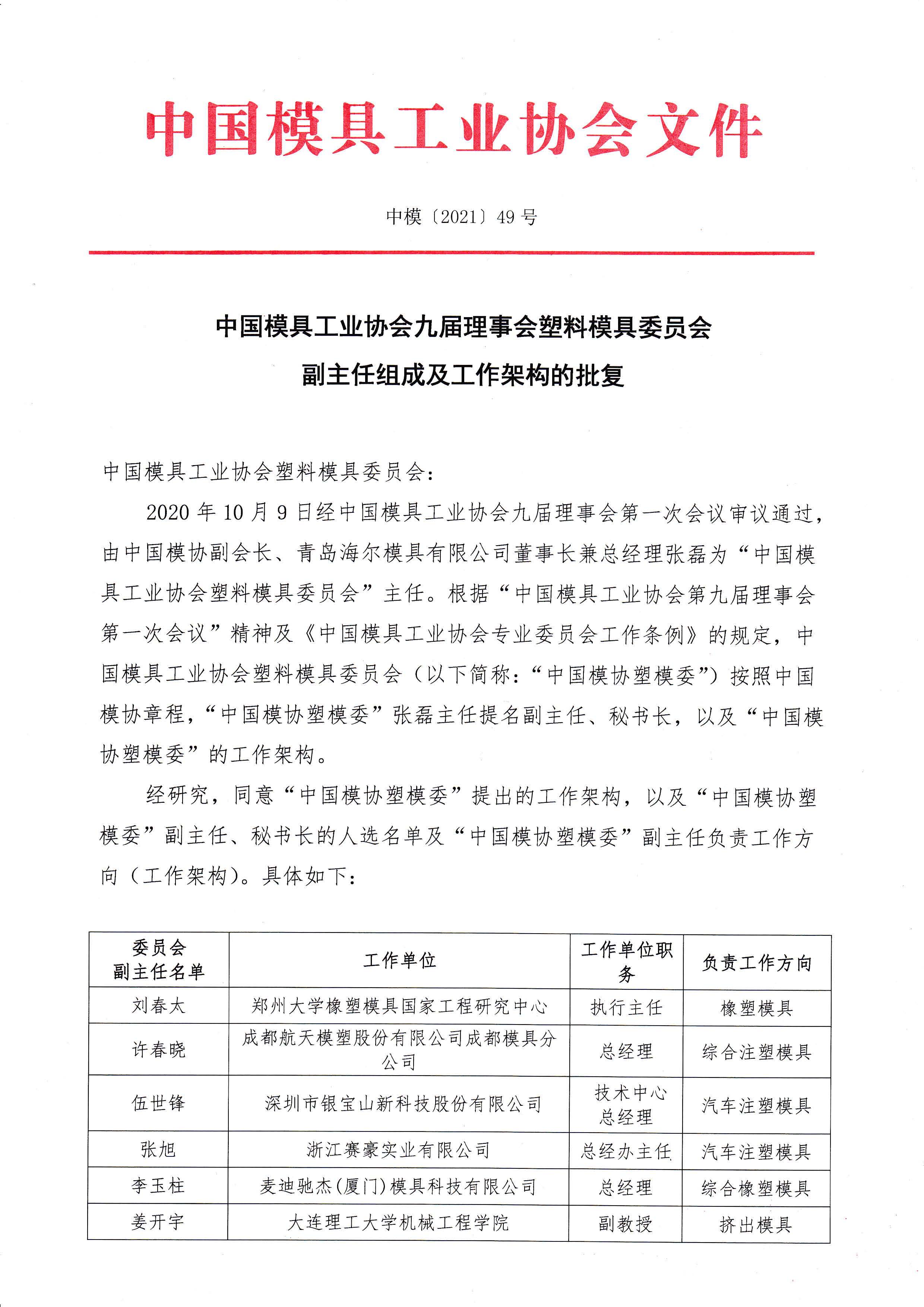 中国模协九届理事会塑料模具委员会副主任组成及工作架构的批复