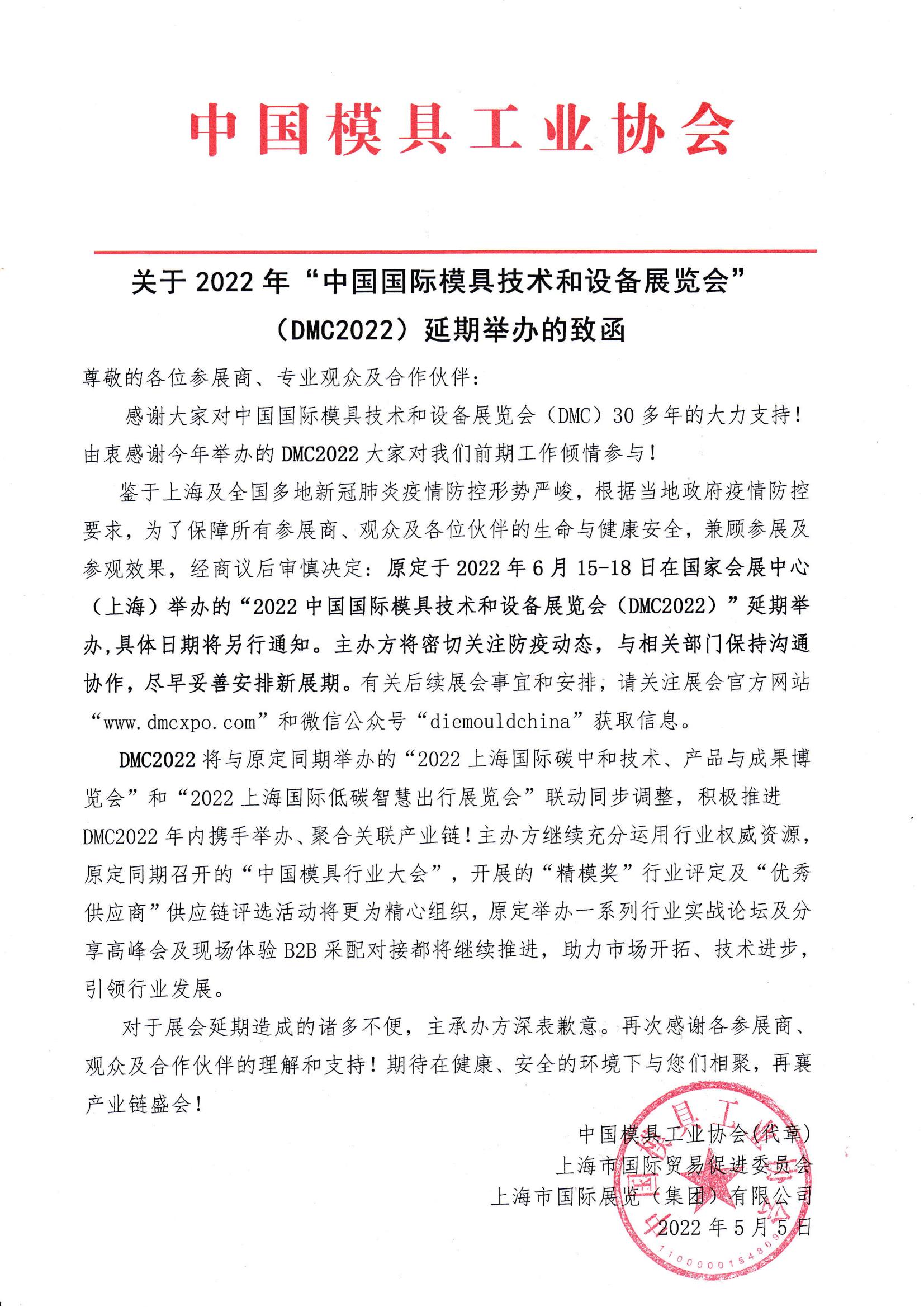关于2022年“中国国际模具技术和设备展览会”(DMC2022)延期举办的致函