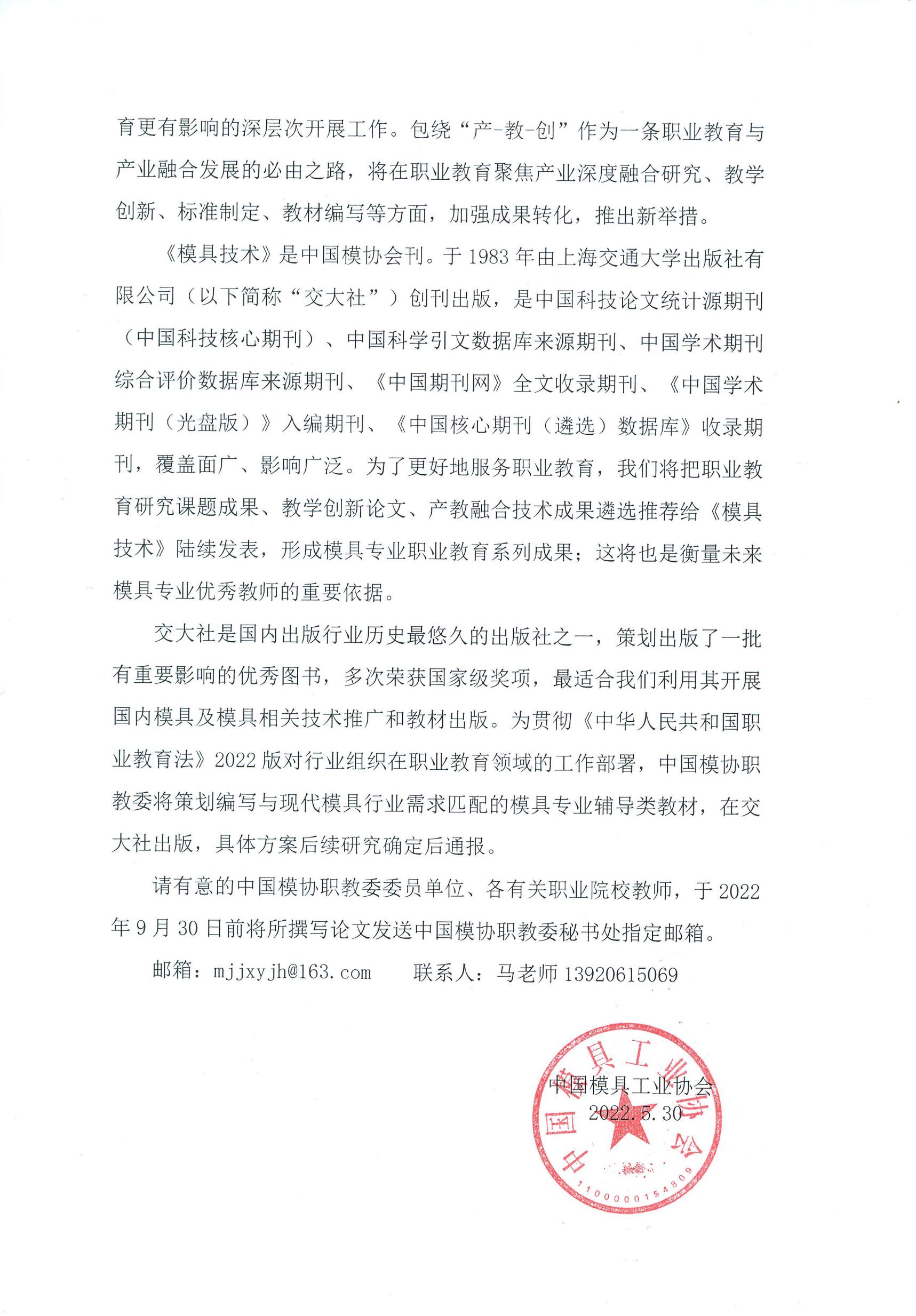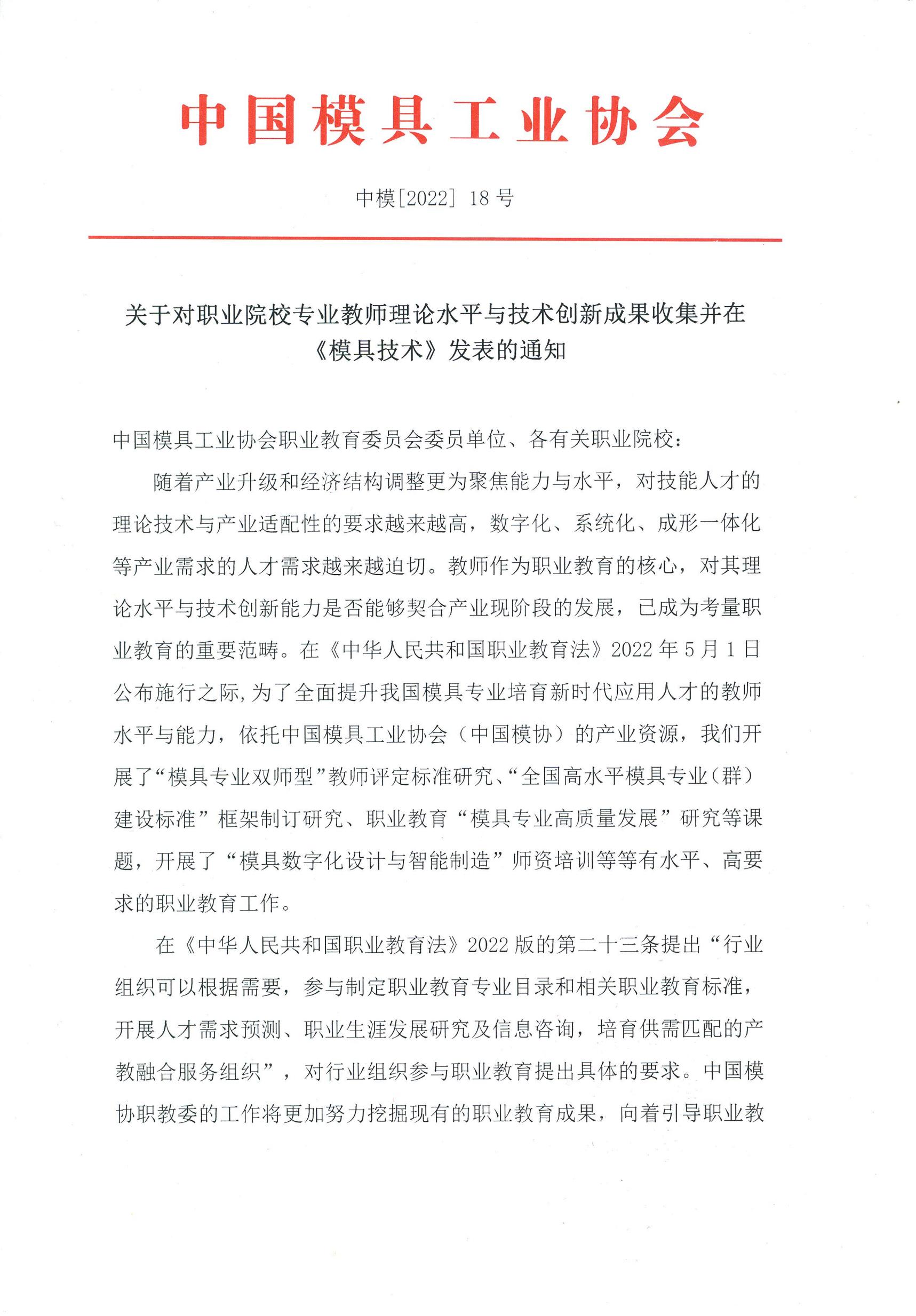 关于对职业院校专业教师理论水平与技术创新成果收集并在《模具技术》发表的通知