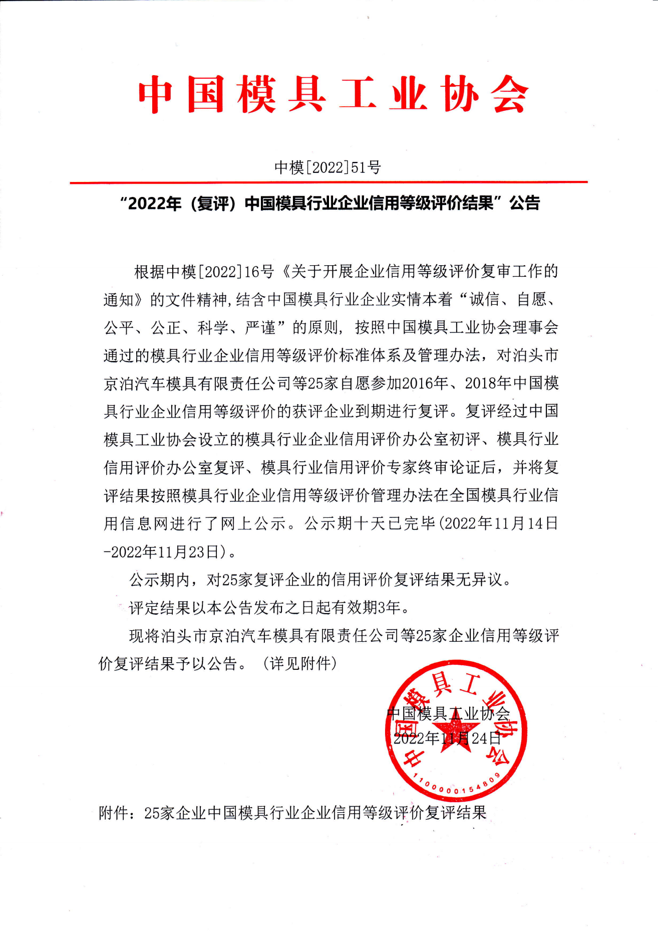 附件:25家企业中国模具行业企业信用等级评价复评结果