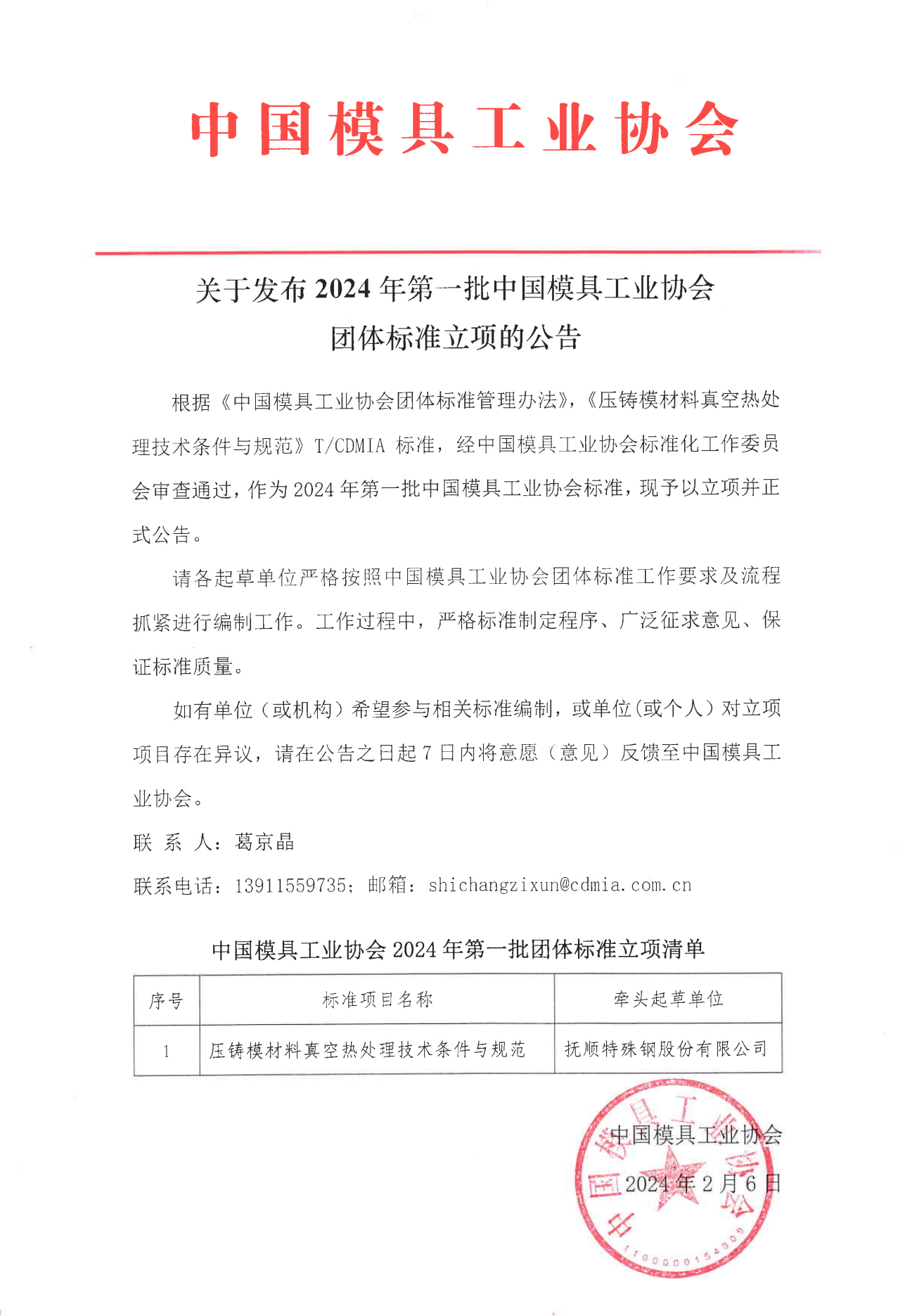 关于发布2024年第一批中国模具工业协会团体标准立项的公告