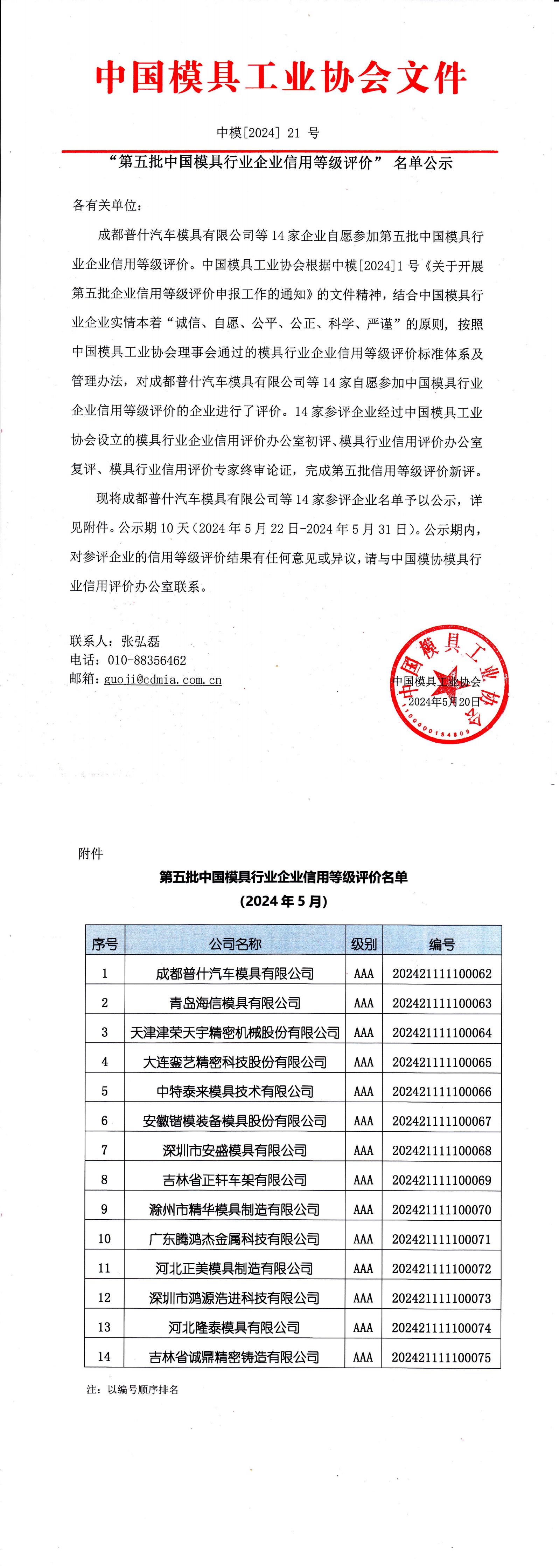 “第五批中国模具行业企业信用等级评价”名单公示