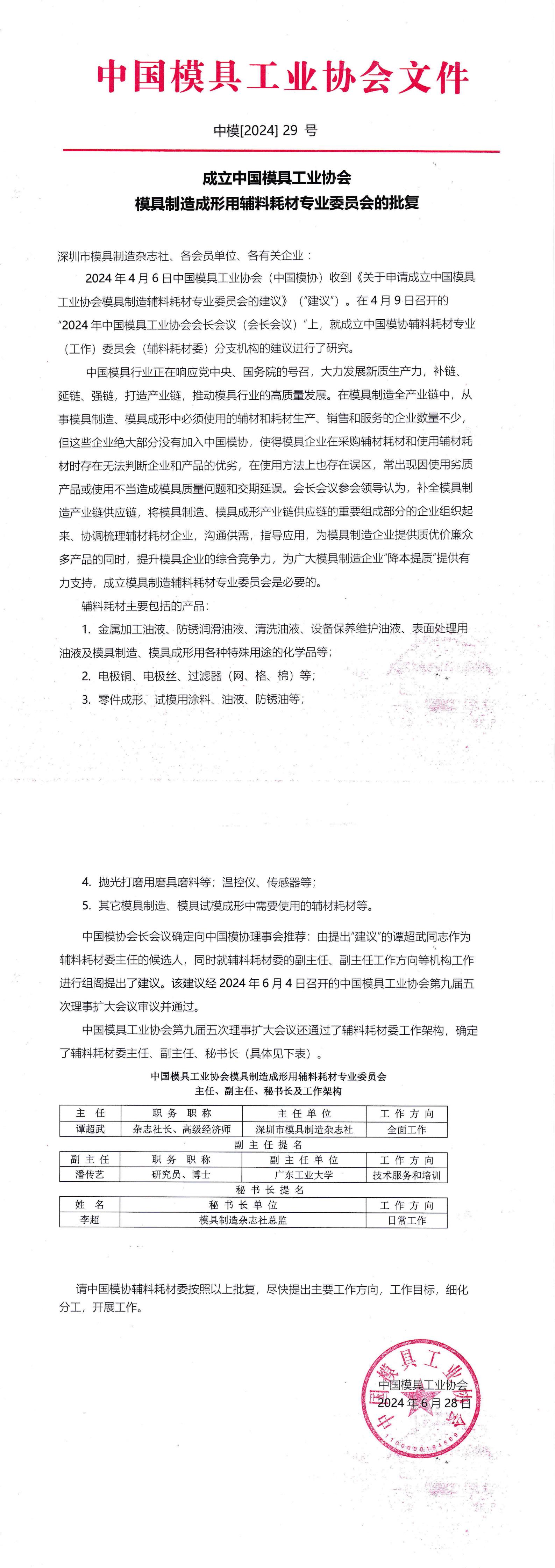 成立中国模具工业协会模具制造成形用辅料耗材专业委员会的批复