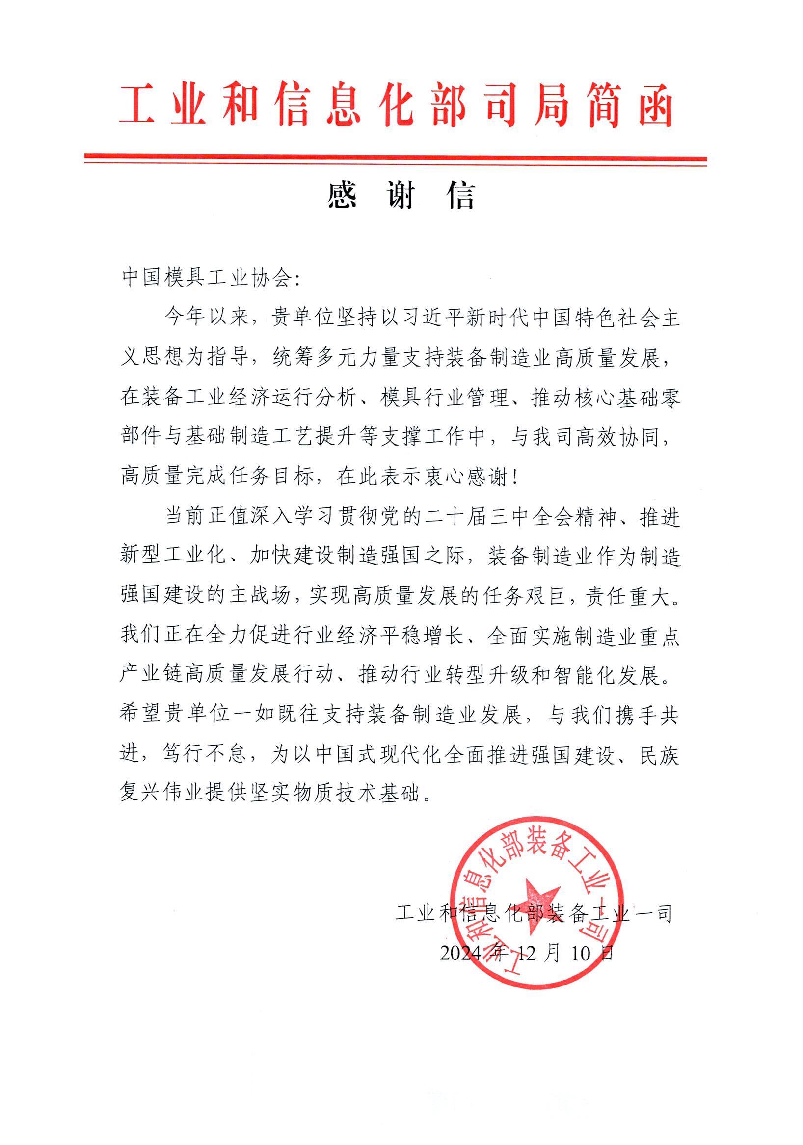 工业和信息化部装备工业一司感谢信