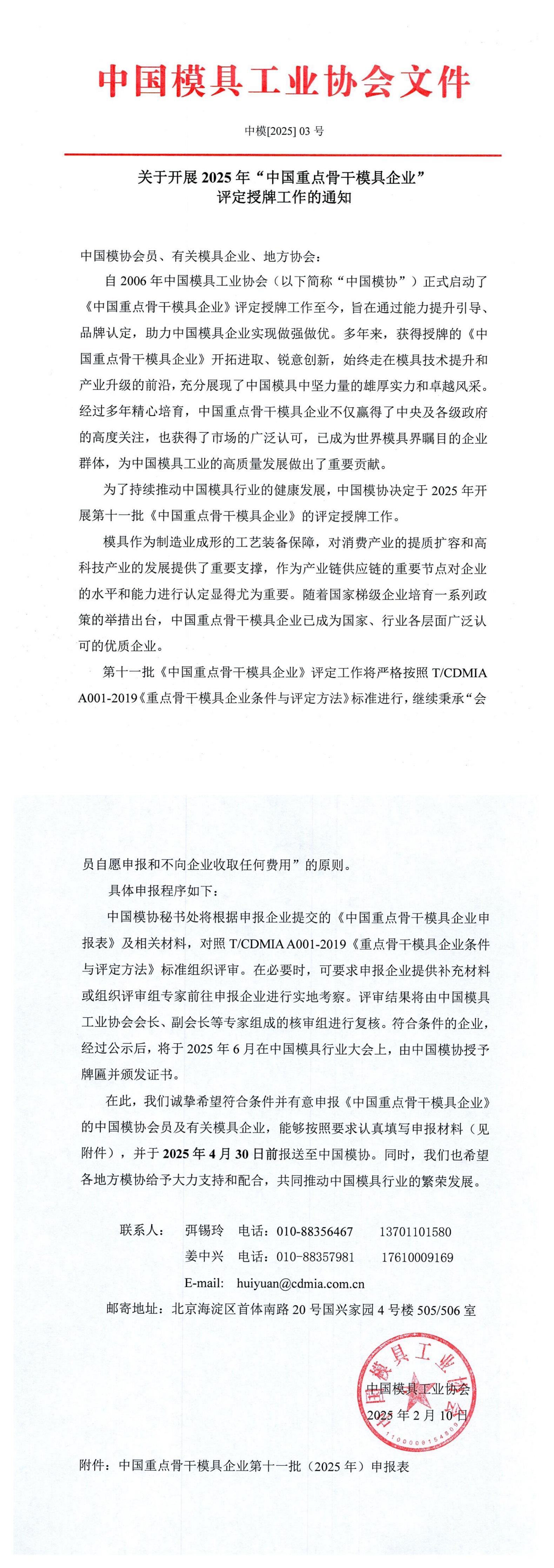 关于开展2025年“中国重点骨干模具企业”评定授牌工作的通知